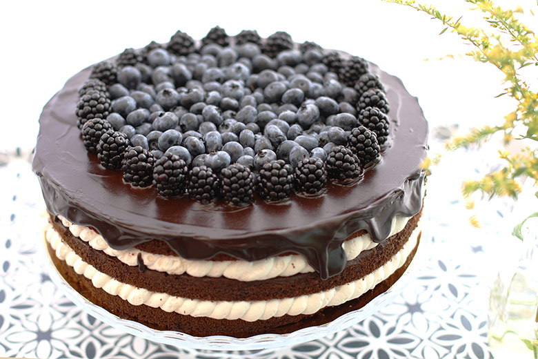 čokoládový piškot, jahodová marmeláda, čokoláda, čokoládový lesk, čerstvé ovoce, smetana 34%, cukr, vanilka